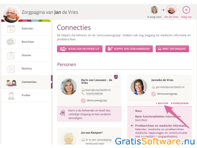 Het blijft mogelijk om extra personen toe te voegen, wat handig is voor als er meerdere mantelzorgers zijn of als u de gegevens dus wilt delen met een professionele zorgverlener. Caren werkt met een ingebouwde kalender en daar voegt u afspraken en taken aan toe. Verder geeft u aan wie er gaat helpen en wat er nodig is. Taken zijn toe te wijzen aan een zorgverlener. Er is een functie om berichten te delen met de andere gebruikers of om notities toe te voegen voor belangrijke informatie. Notities zijn zichtbaar voor alle mantelzorgers. Zo houdt u elkaar op de hoogte en krijgt de patiënt de zorg die nodig is.